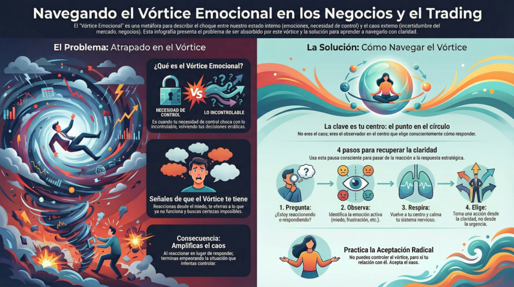 • Estar en el Vórtice: Significa reaccionar, aferrarte con desesperación e intentar controlar lo incontrolable. En trading, es cuando pierdes una operación, tu frecuencia interna se desafina y entras en otra posición desde la necesidad de recuperar, no desde la estrategia. El Vórtice te arrastró.